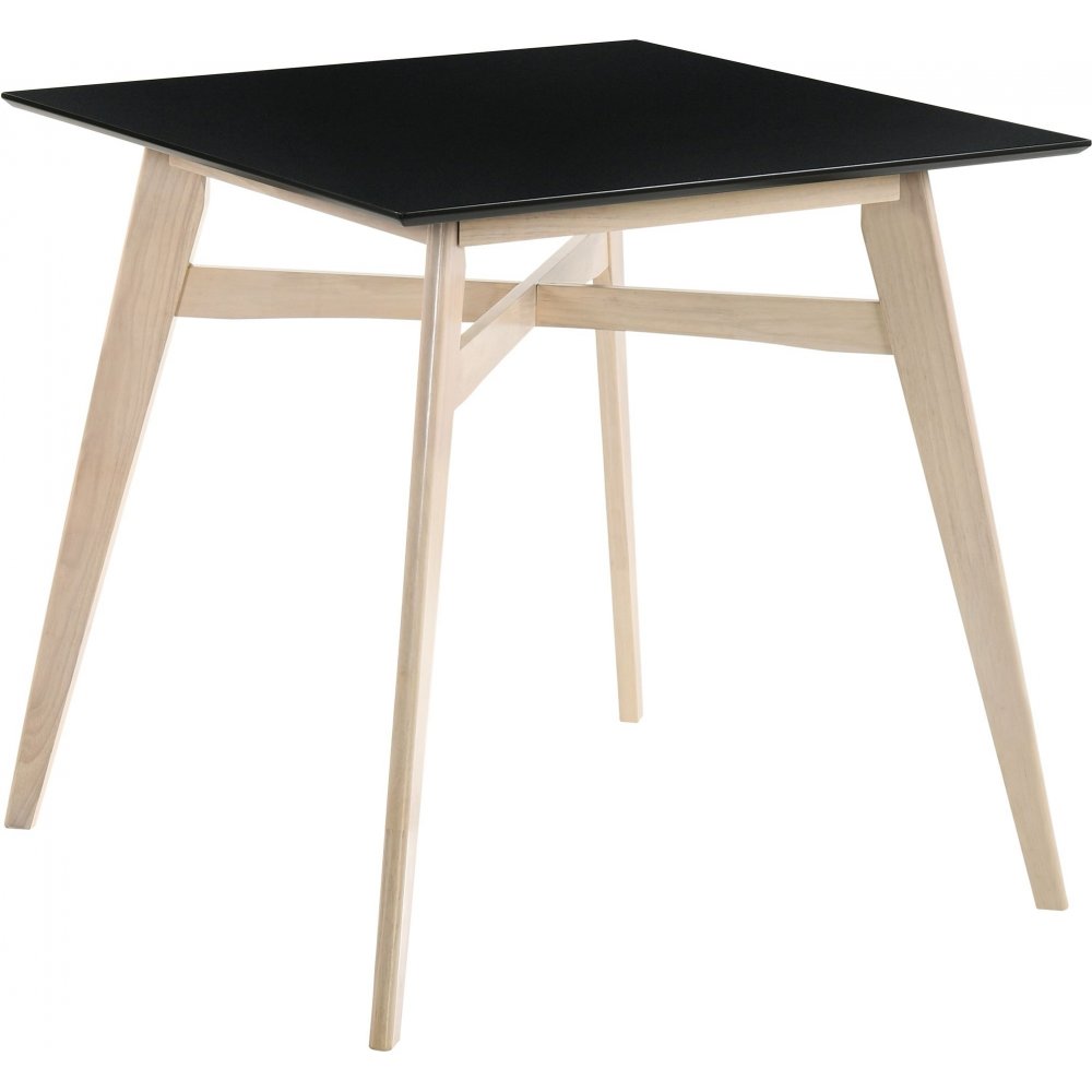 En komplett matgrupp i barhöjd bestående av ett fyrkantigt barbord och fyra barstolar. Bordet har ett underrede i whitewash och en svart toppskiva. Barstolarna är tillverkade i samma stil med underrede i whitewash och en sits i svart PU. Stolarna har ett svängt ryggstöd för ökad sittkomfort.