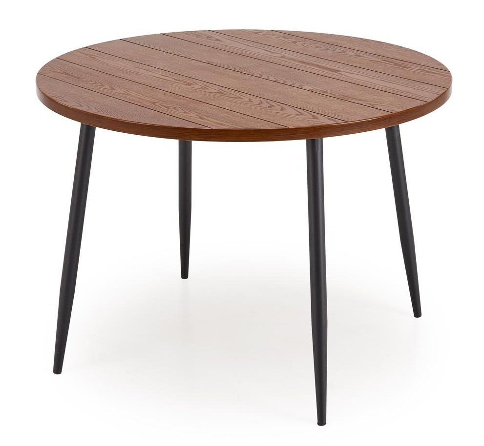 Matgruppen Dana & Sara kombinerar varm träkänsla med klassisk elegans och naturliga material. Det runda Dana matbordet har en vackert valnötsfärgad bordsskiva med tydlig trästruktur och subtila längsgående skåror som ger karaktär och djup. Den moderna underredesdesignen i svart metall med konformade ben skapar en elegant kontrast och ett luftigt intryck, vilket gör bordet lättplacerat i både moderna och traditionella hem.