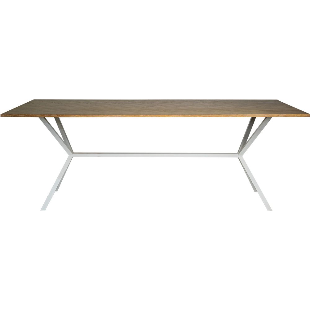 Revel matbord med vitt underrede i metall och toppskiva av fanér med fiskbensmönster. Ett stort matbord som ger plats åt många, kombinera gärna med stolar.