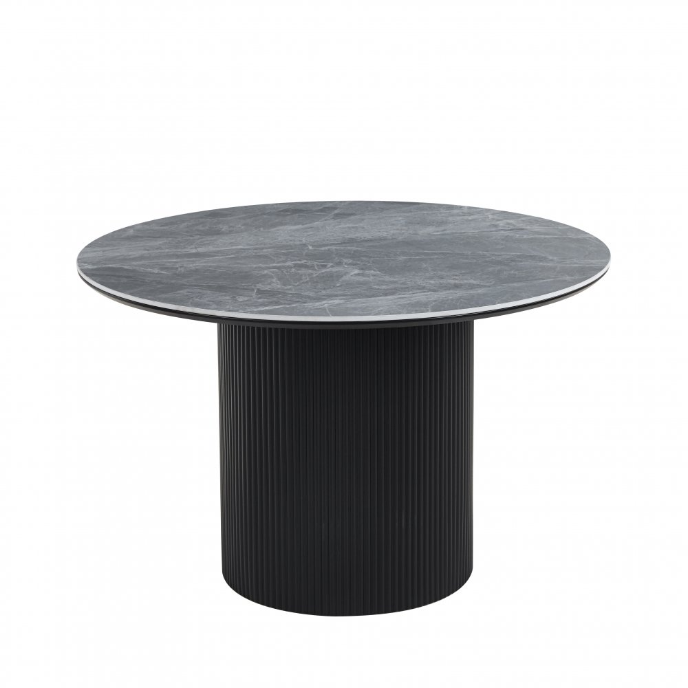 En elegant och modern matgrupp som kombinerar stilren design med slitstarka material. Salvador matbord har en rund bordsskiva i grå keramisk sten som är både tålig och lätt att underhålla – perfekt för vardagens måltider såväl som festligare tillfällen. Det svartlackade träsunderredet ger en stabil konstruktion och en sofistikerad kontrast mot den ljusa bordsskivan.