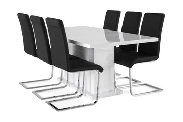Ratliff Matgrupp 180 cm + 6 Stolar Förlängningsbart med illäggsskiva, Vit / Svart Pu / Krom
